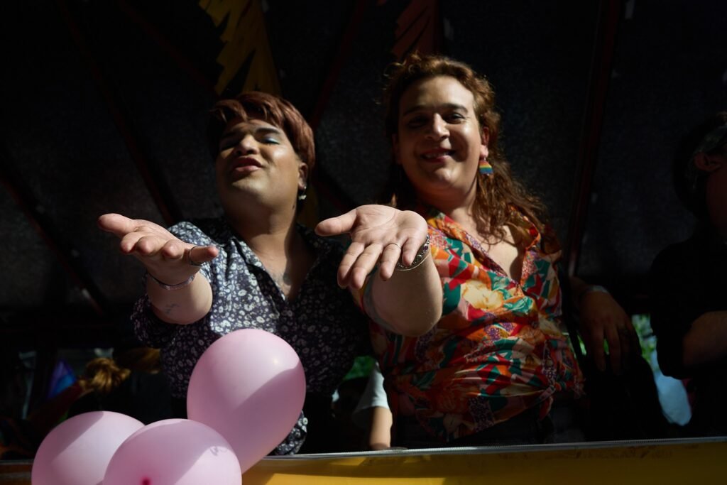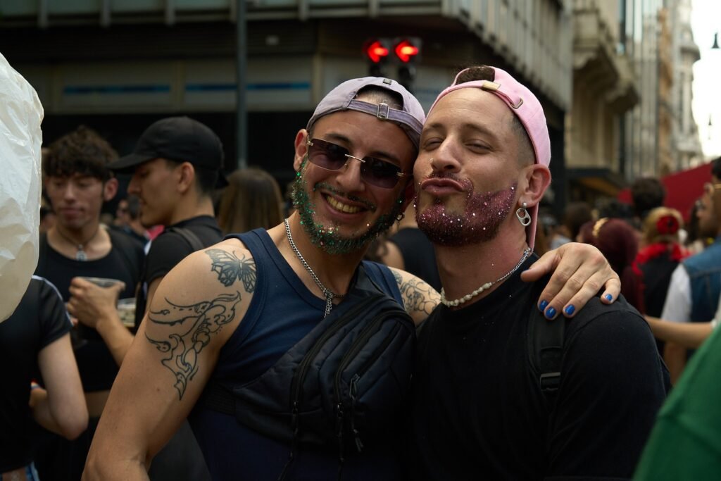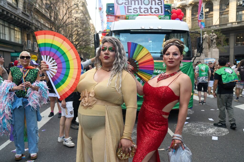 Otra postal repetida: cochecitos, orejitas brillantes, carretones con snacks y abuelos con banderines acompañando a nietes. La Marcha volvió a ser un espacio intergeneracional, con grupos de estudiantes, parejas y familias que eligieron vivir la experiencia completa: feria, desfile y shows. Entre veredas y diagonales, la convivencia de edades y estilos creó una atmósfera hospitalaria para quienes asistieron por primera vez. Se notó especialmente la presencia de amistades con looks temáticos —plumas, plataformas, maquillaje neón— y la curiosidad por sacarse fotos junto a carrozas y performers. El registro periodístico enfatizó ese tono de acompañamiento y disfrute sin incidentes relevantes, ideal para que la experiencia sea recordada como un día de paseo tanto como una cita cultural y comunitaria.
