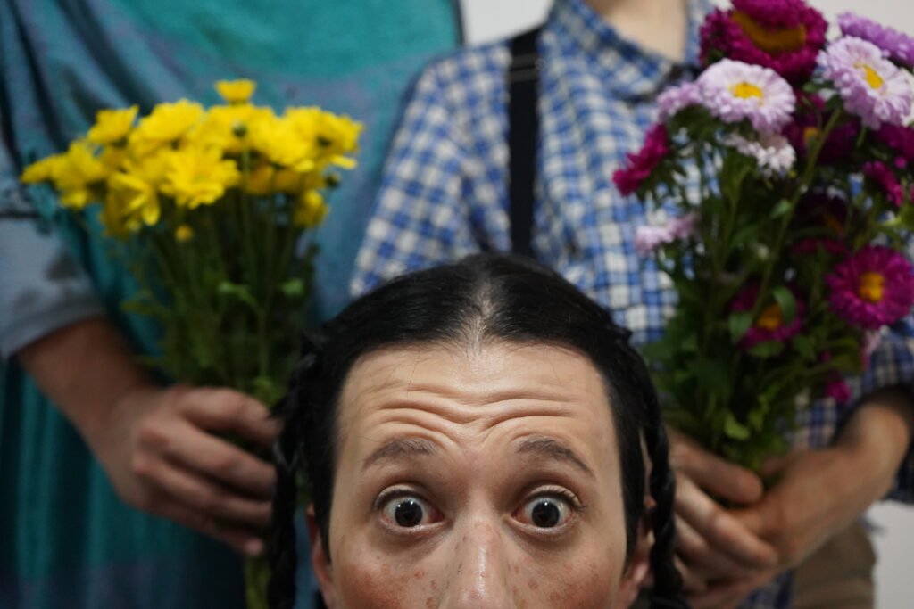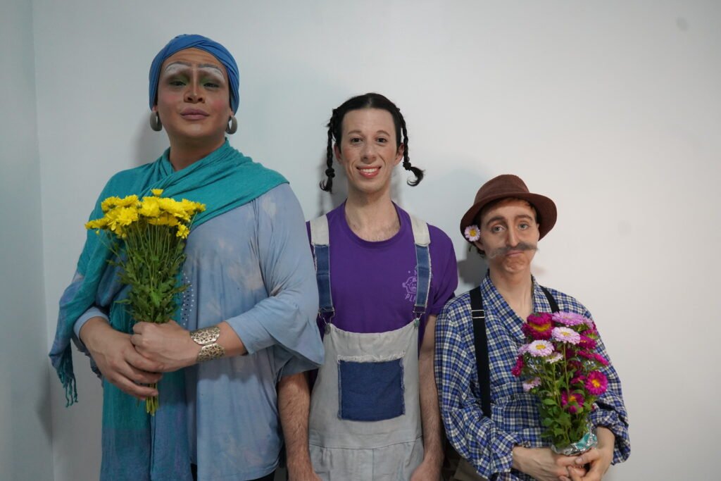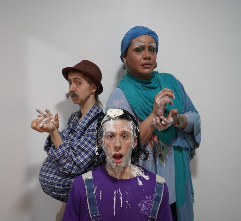Visualmente, la puesta sorprende: torta, flores, espuma en la cara, vestuario marcado y un clima que parece festivo… pero no lo es del todo. La obra dialoga con el clown, la comedia física, el grotesco y un realismo quebrado, sin encasillarse en un solo género.