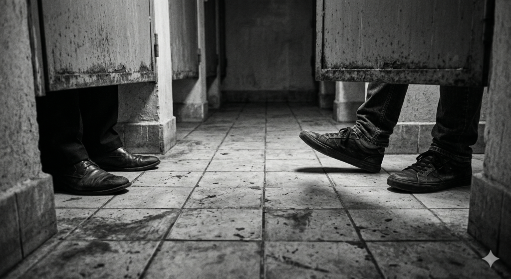 • El golpecito (Foot Tapping): El clásico de los clásicos, inmortalizado hasta en películas de Hollywood. Si estabas dentro de un cubículo cerrado (el inodoro), la jugada era asomar un poco la punta del zapato por debajo de la división y dar un sutil golpecito en el piso. Si el vecino del cubículo de al lado respondía acercando su pie o devolviendo el golpe, el trato estaba cerrado.