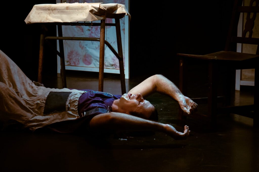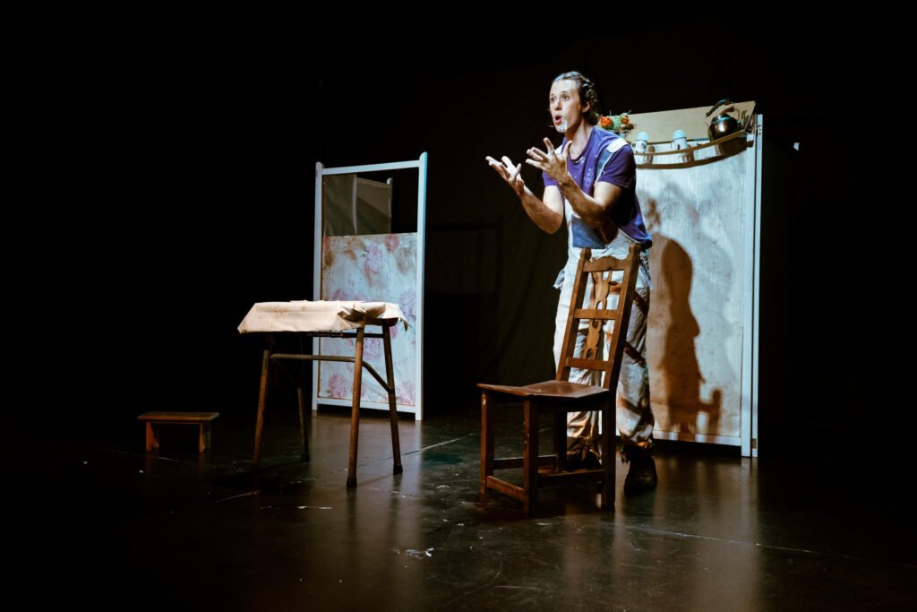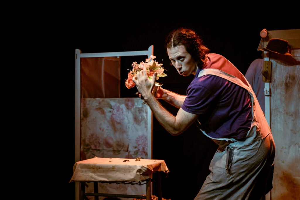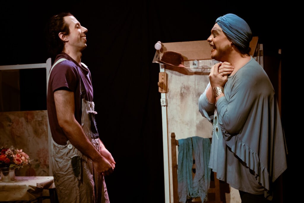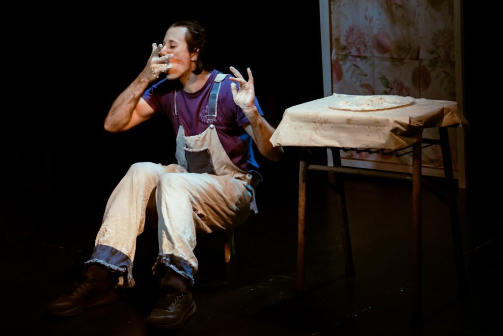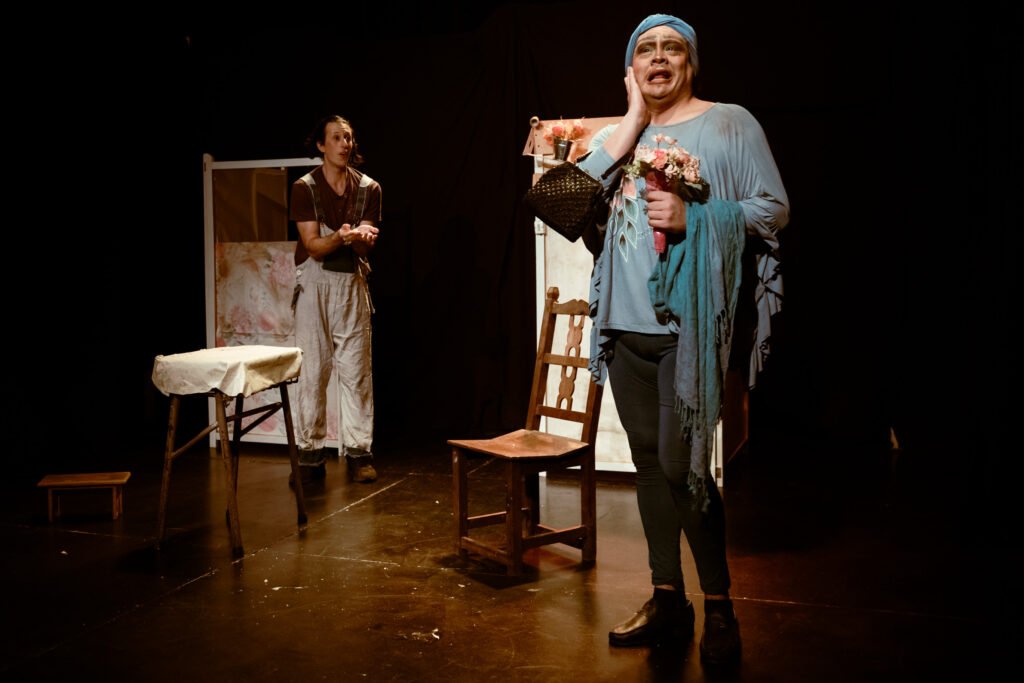 – Visualmente la obra se presenta colorida, con torta, flores, espuma en la cara, vestuario muy marcado. ¿Qué lenguaje escénico te guía: clown, comedia física, realismo roto, farsa…? ¿Cómo llegaste a ese código?
