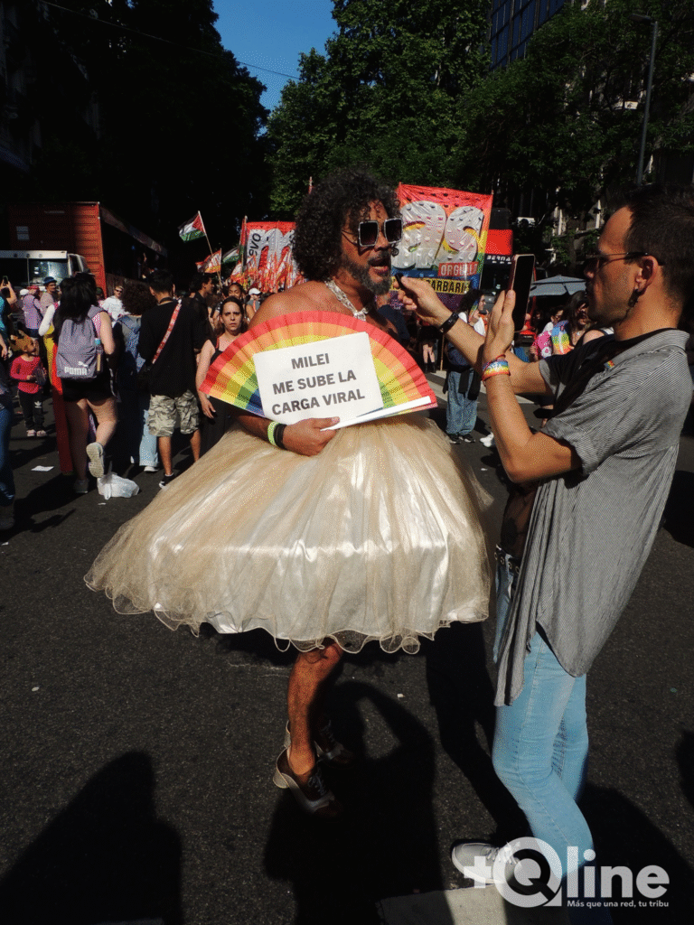 Me emocionó pasar a saludar a Jessica Millanan, una gran mujer trans  que inauguró su salón de belleza justo en el Día del Orgullo; Alí le hizo una entrevista para una nota de +QLine, y yo, Brahan, charlé con varias personas de outfits coloridos y temáticos que me despertaban curiosidad. También nos entrevistaron un equipo de prensa; respondimos en base a lo que se desea y busca en condiciones de igualdad, seguridad y desarrollo para todas las sociedades que hacemos vida en la nación y lo mismo que veíamos alrededor: familias con sus hijos, madres y abuelos acompañando, y carteles que pedían cuidado, igualdad y seguridad. Al principio la gente estaba dispersa, pero la señalización sencilla y la feria como base ayudaron a concentrar en Plaza de Mayo y a ordenar la espera de la salida. Para quien planifique venir el próximo año, el dato enfocado se repitió en todas partes: feria desde la mañana y marcha a las 16 horas hacia el Congreso.
