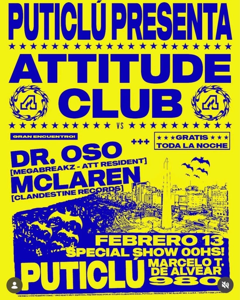Gran encuentro VS. Gratis toda la noche. 🎧 Line Up: Dr. Oso (Megabreakz) vs McLaren (Clandestine Records). 📍 Dónde: Marcelo T. de Alvear 980 (Puticlú). 🔗 Más info: @esunputiclu